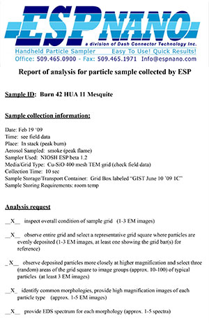 The ESPnano Model 100 was designed to collect representative samples of airborne particles to be analyzed by electron microscopy, providng data such as that in the Sample Report attached.